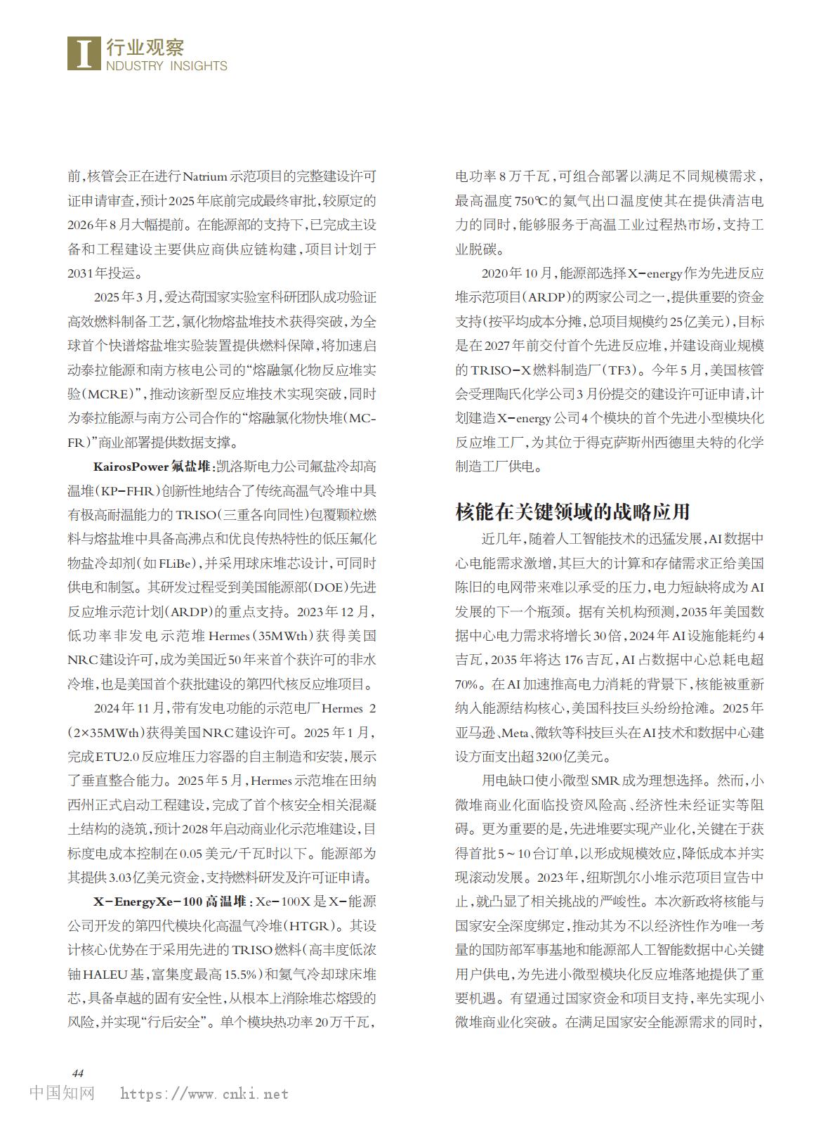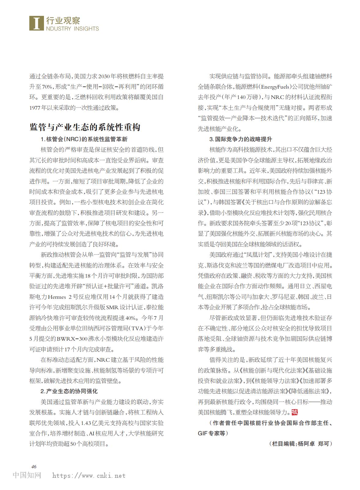 美国核能新政对其先进核能和 核燃料发展的影响